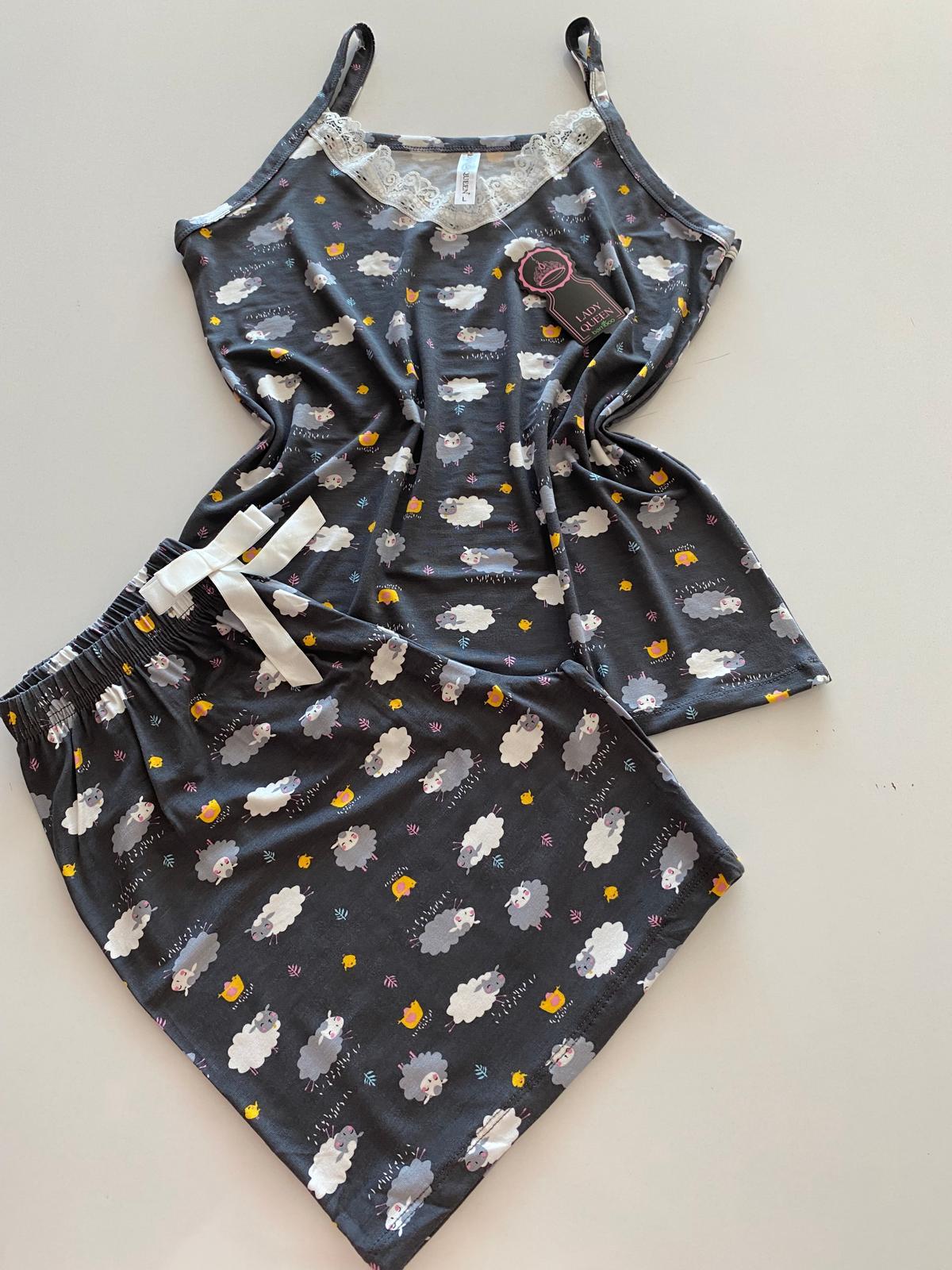 Lady Queen - Gri Koyun Desenli - 6016 Likralı Ring Viskon Şort Takım