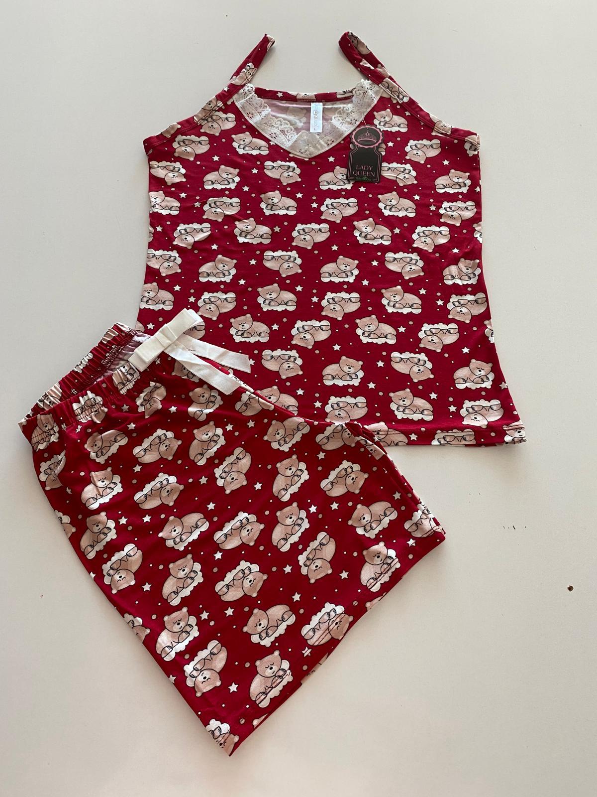 Lady Queen - Kırmızı Ayıcık Desenli - 6016 Likralı Ring Viskon Şort Takım