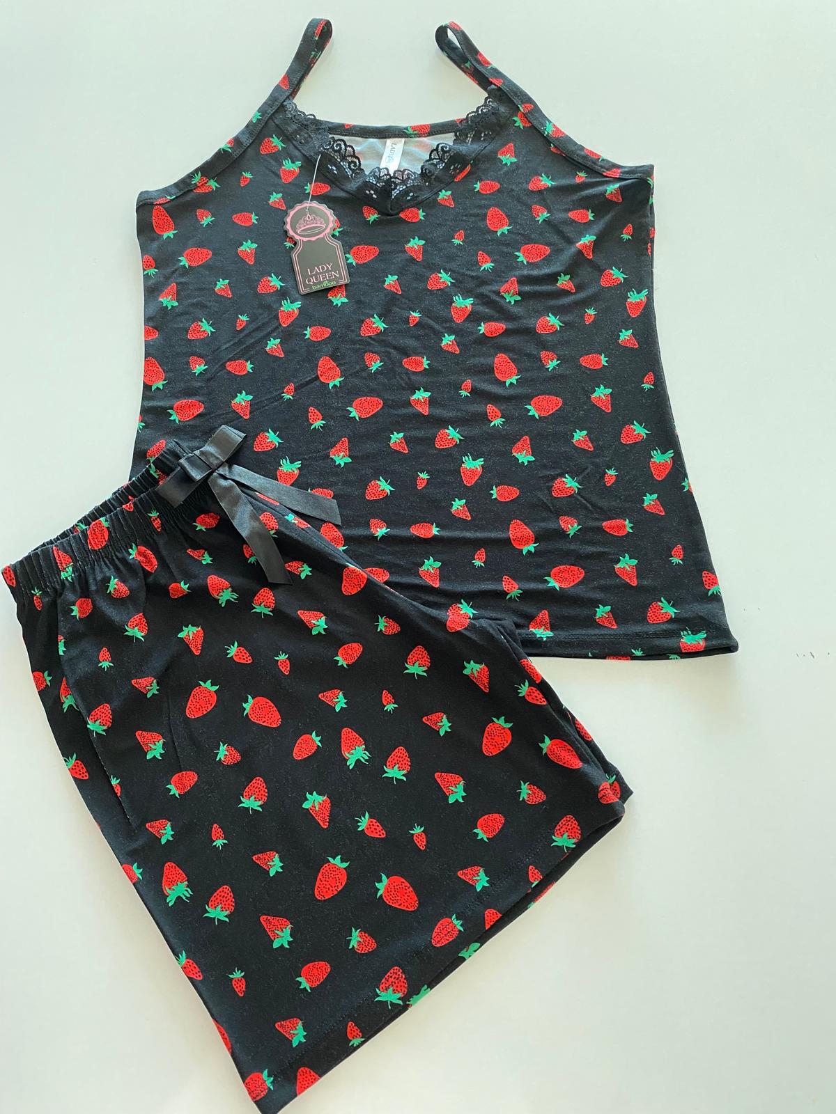 Lady Queen - Siyah Çilek Desenli - 6016 Likralı Ring Viskon Şort Takım